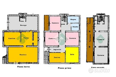 * Piano Terra: ampio rustico con camino, bagno, ripostiglio, cantina, fondo e garage.
