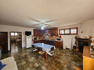 L'abitazione principale si sviluppa al piano rialzato ed è accolta da un ingresso elegante che conduce alla cucina, collegata a un ampio terrazzo laterale, e al tinello con camino e aria condizionata, perfetto per momenti conviviali.