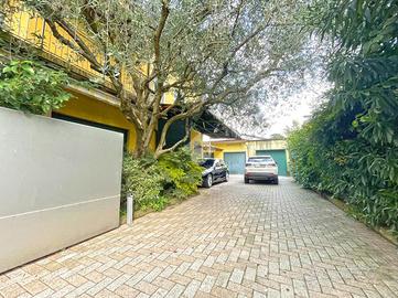 Un ampio cortile pavimentato completa la parte esterna, dalla quale si può accedere ai due garage singoli e al magazzino sul retro.