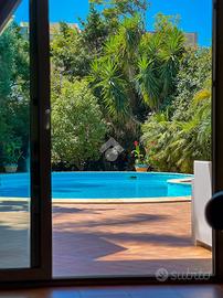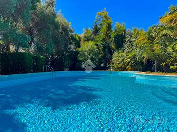 Al piano terra, il cuore della villa è l'ampio soggiorno con camino, affiancato dalla sala da pranzo e impreziosito da grandi vetrate che si affacciano sulla corte esterna. Qui troviamo la piscina con acqua salata, inserita in un elegante giardino di circa 900 mq, dove pavimentazioni, spazi verdi e zone relax creano un'oasi privata perfetta per momenti conviviali o di totale relax. Completano il piano una cucina funzionale, un bagno con box doccia e una zona lavanderia organizzata.