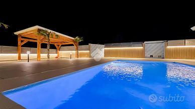 All'esterno, ogni elemento contribuisce a definire il carattere della villa: la doccia a servizio della piscina, il gazebo in legno per le auto, la cura delle finiture, la pavimentazione della corte, la luce soffusa che valorizza gli spazi nelle ore serali. Nulla è lasciato al caso, perché qui anche il dettaglio partecipa alla qualità complessiva dell'abitare.