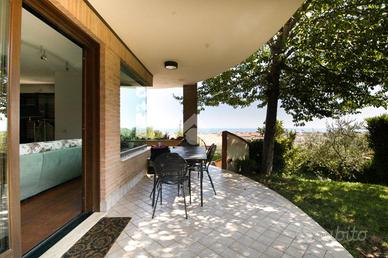 Al primo piano si apre la zona giorno, caratterizzata da un grande soggiorno con vetrate panoramiche che regalano una splendida vista mare, cucina abitabile, permette l'accesso diretto al patio esterno, ideale per vivere momenti all'aperto in totale privacy. Il giardino, con piscina esclusiva, rappresenta il cuore della casa, un ambiente riservato dove trascorrere le giornate estive. Sempre sullo stesso livello sono presenti un bagno finestrato e un comodo ripostiglio.