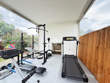 L'accesso alla proprietà avviene tramite cancello automatico. La villa si sviluppa su due livelli e dispone inoltre di una zona palestra coperta con affaccio sul verde, perfetta come area hobby o box auto.