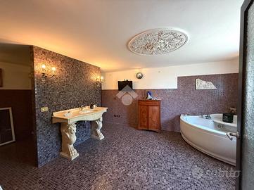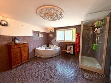 Il piano terra è invece un vero e proprio spazio dedicato al relax e alla convivialità. Ingresso su ampia sala con camino e angolo cottura, ideale per momenti in famiglia o con gli amici. Il bagno, in stile centro benessere, è un piccolo gioiello: vasca idromassaggio, doccia multifunzione, materiali ricercati e atmosfere che invitano a prendersi una pausa dal mondo.