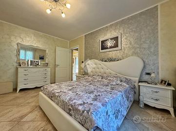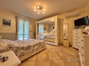 All'esterno, un terrazzo coperto perfetto per pranzi e cene in ogni stagione introduce al grande giardino di circa 3.300 mq, arricchito da una splendida piscina con area dehor, ideale per momenti di relax e convivialità.