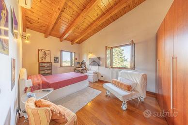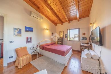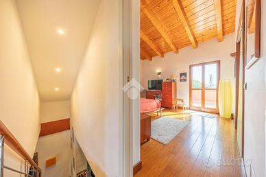 Percorrendo la scala interna rifinita in legno, ci troviamo nella zona notte, dove il disimpegno conduce in una delle prime camere da letto. Ampia e luminosa, la camera è caratterizzata da travi a vista e pavimento in legno. L'ambiente presenta due finestre, una delle quali realizzata per consentire l'uscita sul grande terrazzo semi perimetrale. La camera inoltre presenta una comoda cabina armadio al suo interno.