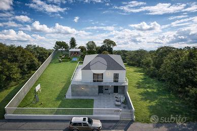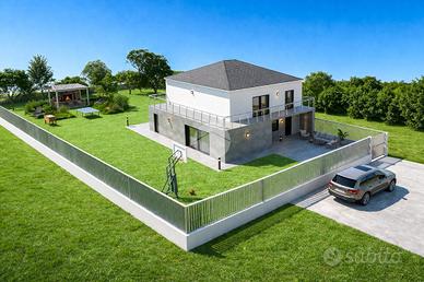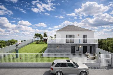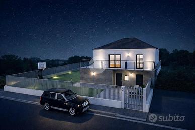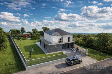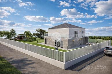In contesto residenziale tranquillo, riservato e immerso nel verde, proponiamo in vendita porzioni di ville di nuova costruzione realizzate secondo i più recenti standard costruttivi ed energetici, caratterizzate da elevata efficienza, comfort abitativo e costi di gestione estremamente contenuti. Le soluzioni, libere su tre lati e dotate di giardino privato, si sviluppano su due livelli abitativi per una superficie complessiva di circa 150 mq, offrendo spazi moderni, funzionali e pensati per le esigenze abitative attuali. Il piano terreno è dedicato alla zona living, con ampio soggiorno open space con cucina a vista, ambiente luminoso e ben sfruttabile, bagno finestrato, locale lavanderia e uscita diretta sul giardino privato, ideale per vivere gli spazi esterni nella bella stagione. Il piano superiore ospita la zona notte, composta da tre camere da letto, secondo bagno e balconi, con una distribuzione razionale degli ambienti che garantisce praticità e comfort quotidiano. Dal punto di vista costruttivo le ville sono realizzate con struttura in cemento armato antisismico, isolamento termo-acustico ad alte prestazioni, serramenti in alluminio a taglio termico di ultima generazione e copertura con tetto ventilato in lamiera aggraffata, soluzione tecnica che migliora isolamento, durata e protezione dell'immobile nel tempo. Particolare attenzione è stata dedicata anche all'efficienza energetica e all'impiantistica: riscaldamento a pavimento alimentato da pompa di calore, predisposizione per impianto fotovoltaico, predisposizione antifurto e climatizzazione, tecnologie che permettono di ottenere consumi ridotti, maggiore autonomia energetica e un comfort abitativo superiore rispetto alle costruzioni tradizionali. Le finiture previste da capitolato sono di ottimo livello, con possibilità di personalizzazione di materiali e dettagli interni, permettendo così di adattare la casa ai propri gusti ed esigenze. Soluzioni ideali per chi è alla ricerca di un'abitazione mod