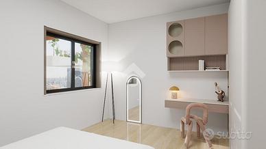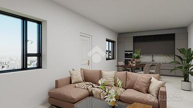 Al piano terra, di circa 100mq, la disposizione prevede un ampio e luminoso soggiorno con cucina a vista, due bagni e, secondo le esigenze, una camera da letto. Tuttavia, la flessibilità del progetto consente di personalizzare gli ambienti.