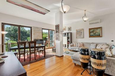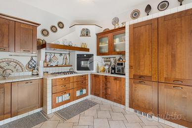 Sempre al primo piano troviamo la cucina abitabile con accesso diretto ad uno spazioso patio pranzabile - ombreggiato da tenda elettrica - a livello giardino; infine uno studio/cameretta ed un ampio bagno con vasca idromassaggio doppia.