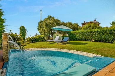 Al primo piano la zona giorno, composta da disimpegno d'ingresso, un soggiorno doppio particolarmente luminoso, con accesso diretto al giardino dotato di impianto irrigazione e robot taglia erba, impreziosito da una minipiscina spa a sfioro di acqua salata, interrata in muratura, perfetta per godersi momenti di benessere all'aperto, il tutto 'recintato' da siepi per garantire la privacy.