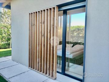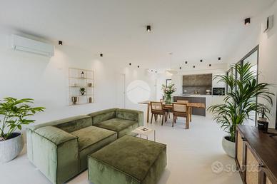 La soluzione è cosi composta: ingresso con armadiature e angolo lavanderia, soggiorno di ampie dimensioni e cucina open space, due camere matrimoniali, due bagni finestrati, meraviglioso portico che si affaccia sul giardino circostante con piscina e n°2 posti auto coperti privati INTERNI alla proprietà.