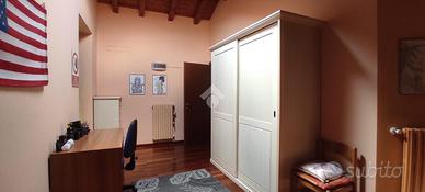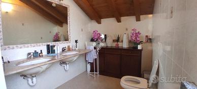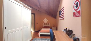 Tramite una comoda scala in muratura, si accede al primo piano, caratterizzato da eleganti travi a vista e completo di camera matrimoniale climatizzata, ampia e luminosa, due camere singole, bagno finestrato dotato di doccia rifinito con materiali neutri.
