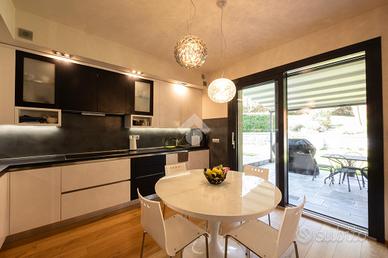L'intera zona giorno beneficia di ampie porte finestre scorrevoli, dalle quali poter godere sia della notevole luminosità che del gradevole affaccio sull'ampia e sfruttabile veranda con pergola doppia elettrica con sensore vento.