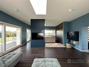 La luminosità degli spazi è garantita tramite ampie aperture scorrevoli che collegano la zona giorno con il grande portico di circa 53 mq. A completare l'area living vi sono due importanti lucernari che, oltre a donare ulteriore luce agli ambienti, garantiscono un ricircolo d'aria naturale. La copertura del corpo a ovest è costituita da un tetto giardino con vista panoramica su tutta la proprietà.