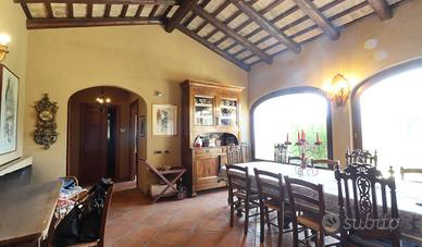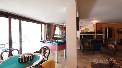 Portico esterno, soggiorno ricreativo, ingresso su zona pranzo con angolo cottura esterno, due bagni, due camere matrimoniali, ripostiglio, legnaia e sala biliardo.