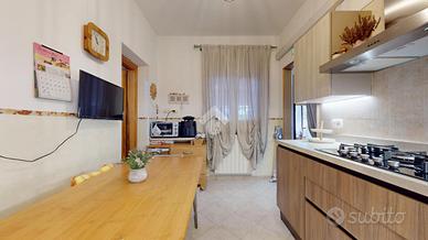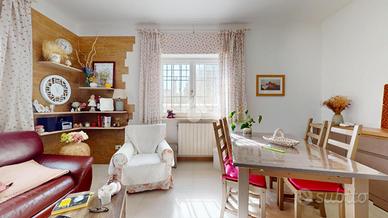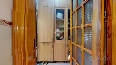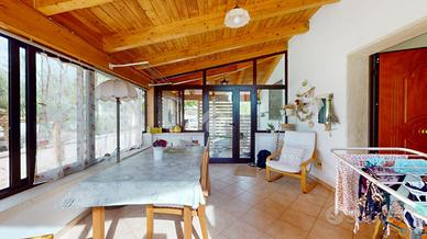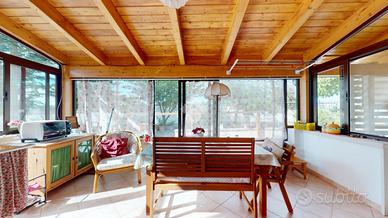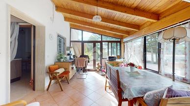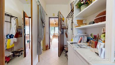 All'ingresso troviamo una veranda in legno chiusa, perfetta come zona relax o giardino d'inverno. L'abitazione si apre su un corridoio centrale: sulla destra si trovano una cucina abitabile su misura e un secondo bagno con doccia.