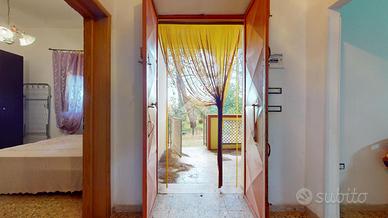 La villa si sviluppa su un unico livello e dispone di una piccola veranda. Entrando, un disimpegno introduce nella zona giorno, composta da sala da pranzo con camino e angolo cottura. La zona notte comprende due camere da letto, mentre il bagno è dotato di doccia.
