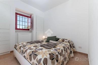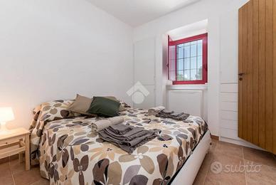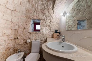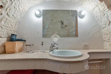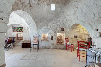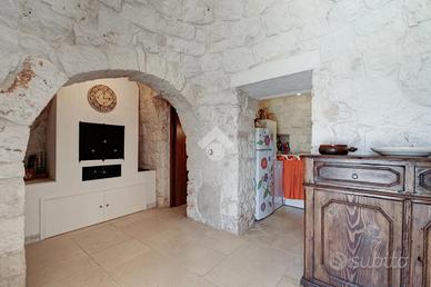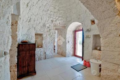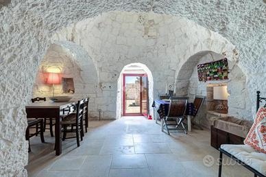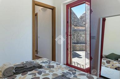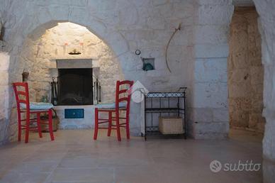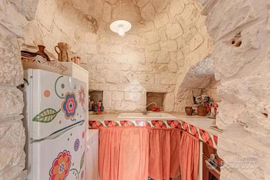 L'accesso alla proprietà avviene tramite un grande piazzale completamente pavimentato, comodo anche come area parcheggio. All'interno dei trulli si sviluppa una luminosissima zona giorno con soggiorno e sala da pranzo, seguita da una piccola stanza adibita a cucinino. La zona notte comprende due camere da letto, un bagno interno con doccino e infine un secondo bagno esterno.