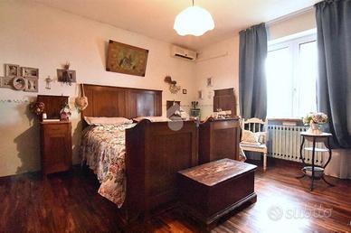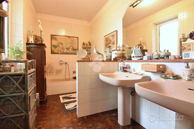 Una splendida scala a chiocciola conduce al piano superiore, dove trova spazio una seconda unità abitativa autonoma: un vero e proprio appartamento indipendente, composto da soggiorno con balcone, cucina separata, camera matrimoniale e bagno finestrato con vasca.