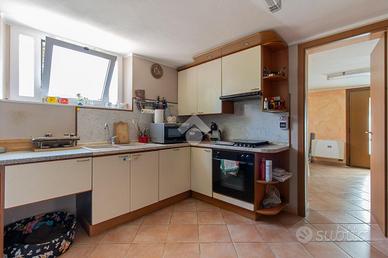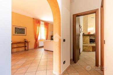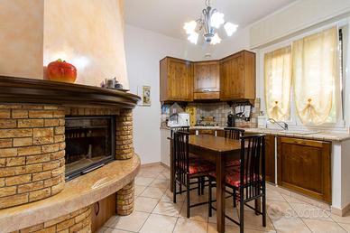 Varcando la soglia d'ingresso, un comodo disimpegno introduce alla zona giorno, dominata da un ampio soggiorno di circa 40 mq. Qui, il fascino del camino in muratura e il calore della stufa a pellet creano un ambiente intimo e accogliente, ideale per momenti di relax e convivialità. La cucina abitabile, spaziosa e funzionale, è anch'essa impreziosita da un suggestivo camino in muratura, perfetto per riscaldare le serate invernali. Completa il piano terra un elegante bagno con sanitari sospesi.