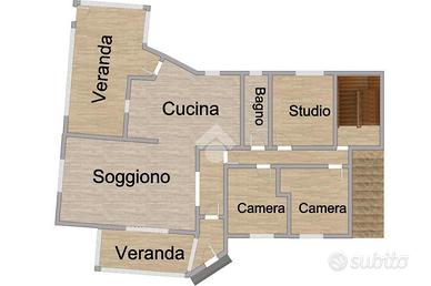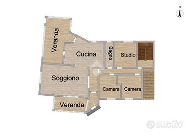 Il piano terra è composto da ingresso in corridoio con salone a vista, cucina, due camere da letto di cui una matrimoniale, studio, bagno e due verande.