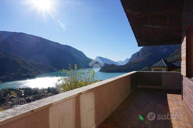 In zona dominante, soleggiata e panoramica con splendida vista Lago, prestigiosa villa indipendente disposta su tre livelli circondata da ampio giardino privato di 600 mq. A piano terra sala hobby, lavanderia, disimpegno, locale caldaia, garage, deposito e ampio garage esterno; a primo piano affascinante zona living di grandi dimensioni a doppia altezza con terrazzo vista lago, angolo cottura, zona pranzo, due stanze da letto, bagno, corridoio e balcone; a secondo piano/sottotetto due ulteriori stanze con due balconi, bagno e corridoio. Termoautonomo. Contesto elegante ed esclusivo. Possibilità di realizzare due unità abitative indipendenti. Completa il contesto terreno pertinenziale di circa 780 mq (di cui 343 mq edificabili).