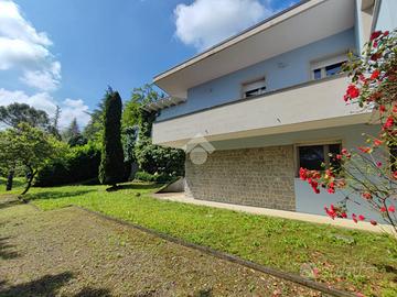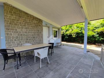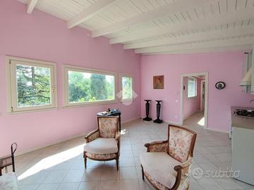La villa, è immersa nel verde del parco di proprietà.Il viale privato costeggia il parco e porta all'abitazione, la quale rimane distante dalla strada e a mezza collina. Il cancello è elettrico e dotato di videocitofono. Dall'ampio terrazzo, ideale per godere del verde che la circonda, si accede all'abitazione. L'ingresso è accogliente e divide il salone dalla cucina, con pratica uscita sul terrazzo.La prima zona notte è composta da una camera da letto matrimoniale, con pareti in legno che la rendono piacevolmente calda, e dal bagno con vasca. La camera padronale, con doppia esposizione, ha la cabina armadio e il bagno privato con doccia grande. L'appartamento adiacente, al quale si può accedere dal giardino sul retro oppure dalla balconata, è autonomo e con predisposizione all'aria condizionata. Si tratta di un bilocale con ampio salone, cucina a vista, una camera da letto matrimoniale e bagno con doccia. I tetti in legno sono a vista e i locali hanno grandi vetrate sul giardino. Tutto il piano è particolarmente luminoso grazie alle grandi finestre e alle portefinestre che danno sui balconi con vista sul parco. Ulteriori due ampie camere, un bagno, il box auto, la lavanderia e un ripostiglio si trovano al piano inferiore, il quale ha ingresso indipendente dal giardino con porta blindata e collegato da due scale interne che portano al piano superiore. Completano l'immobile anche la cantina con botti in cemento, locale caldaia e porticato con vista sul giardino. Il giardino è in piano e, grazie all'esposizione e alla privacy delle siepi, si presta alla realizzazione di una piscina. Il grazioso giardino sul retro con il romantico glicine ha un locale già predisposto, in parte, alla realizzazione di un monolocale, e altri due locali utilizzabili anche per accogliere cavalli o cani. La ristrutturazione è recente e di qualità, realizzata con originali materiali come piastrelle pregiate di Vietri Antico e i pavimenti in pietra lavica. Gli infissi sono in legno pregiato...