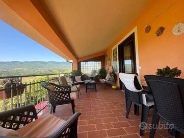 La soluzione si sviluppa su più livelli, piano terra con vari locali, deposito, legnaia, cantina di circa 20 mq, una tavernetta di circa 62 mq, e un portico di circa 94mq. Attaverso delle scale esterne accediamo al primo piano in cui troviamo, un ampio soggiorno di circa 40 mq, con uscita sul comodo terrazzo di circa 16 mq con una vista mozzafiato, cucina abitabile di 26 mq, con uscita sul balcone dell'ingresso. Attraverso il disimpegno accediamo alla zona notte: camera da letto matrimoniale di 19 mq, con uscita sul terrazzo condiviso con la zona giorno, una cabina armadio, un camera singola. Un bagno con finestra e vasca. Una metratura commerciale di 150 mq.
