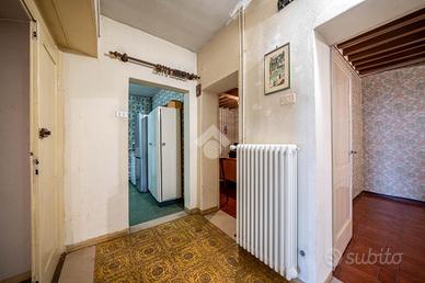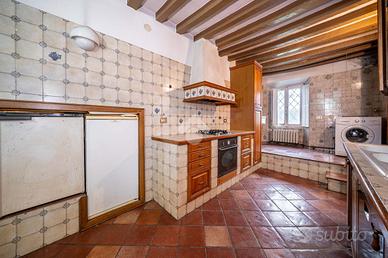 Adiacente vi è la cucina abitabile con cucina in muratura, un bagno molto ampio con doccia e vasca, probabilmente ristrutturato vs i primi anni 2000, ripostiglio cieco, capiente e infine una camera matrimoniale o studio con il soffitto a volta che affaccia sul lato del parco.