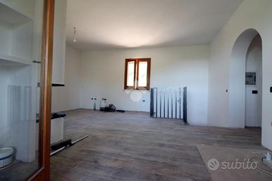Al piano terra adibito ad abitazione principale, troviamo ingresso, ampio soggiorno con camino, cucinotto, due camere da letto e due bagni, entrambi dotati di box doccia. Dalla zona giorno c'è accesso diretto al portico con travi in legno, pianelle e colonne in pietra che fanno da cornice al panorama Sabino.