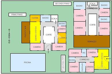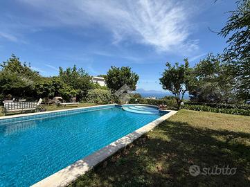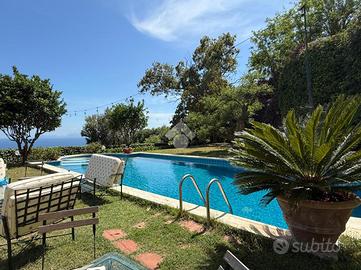 Prima unità disposta su due livelli è composta da: ingresso in corte, due cucine funzionali, due spaziosi saloni, di cui il terzo immerso nel verde e circondato da vetrate per essere vissuto tutto l'anno, sei camere da letto ogni una con servizio in camera, un pratico ripostiglio , ampio giardino con piscina privata e terrazzo panoramico con splendida vista sul mare.