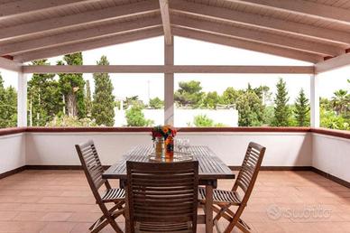 Imponente villa con vista mare in Salento Ionico Ubicata tra Porto Cesareo e Sant'Isidoro, questa splendida villa offre una vista mare mozzafiato ed è immersa in un lussureggiante giardino di 5000 mq ed è situata a poche centinaia di metri dalla spiaggia, all'interno della zona marina protetta. Esterni e giardino * Ingressi: La villa dispone di due ingressi indipendenti, posti su lati opposti per garantire la massima privacy. * Privacy: Alti muri delimitano lo spazio esterno, assicurando riservatezza. * Giardino anteriore: Un importante viale d'ingresso, fiancheggiato da alti pini e da un rigoglioso prato verde. * Giardino posteriore: Un viale con due bracci concentrici, che delimitano una grande area centrale ricca di palme, mirto, vegetazione della macchia mediterranea e alberi vari. Le zone perimetrali ospitano piante ornamentali, pini e un fico con due varietà di frutti. * Veranda: Sul retro si trova una grande veranda coperta di circa 90 mq, con belle colonne portanti, attrezzata con un grande tavolo in legno, forno e barbecue in pietra.Interni * Piano Terra: * Soggiorno: Un grande e incantevole soggiorno arredato con mobilia di pregio, tra cui un salotto in midollino, un tavolo croce di Malta, una televisione da 47 pollici, tavoli, credenze e quadri di gusto. * Bagno di servizio: Completo di doccia, accessibile dal soggiorno. * Cucina: Composta da due ambienti; uno con piano cottura e lavastoviglie, l'altro con una cucina componibile dotata di frigo e scomparti. Dalla cucina si accede al giardino posteriore. * Scala in marmo: Una caratteristica scala tondeggiante in marmo conduce alla zona notte al piano superiore. * Primo Piano: * Camere da letto: Quattro camere comode e accoglienti, ognuna con il proprio bagno. Due camere sono dotate di balcone esterno, una di una bella terrazza coperta con vista mare ad Est e vista giardino su altri lati, mentre una camera è senza balcone. Tutte le camere sono dotate di aria condizionata e