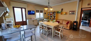 La soluzione presenta, già a primo impatto esterno, due ingressi, ognuno indipendente dall'altro: internamente l'ambiente è stato studiato per essere vissuto da un'unica famiglia ma, per esigenze diverse, si ha la possibilità di ricavare una seconda unità abitativa collegata o distinta, in quanto c'è già la predisposizione all'allacciamento della seconda utenza oltre ad avere già due cucine separate. E' inoltre possibile sopraelevare la struttura e quindi ricreare un ulteriore piano. Al momento l'abitazione vanta una grande cucina separata e abitabile con balcone e affaccio sul giardino, un ampio salone con cucinotto separato, tre camere da letto di cui due matrimoniali e una singola comoda, due bagni finestrati di cui uno con box doccia e un ripostiglio. Al piano interrato, invece, collegato direttamente con l'abitazione, ampia taverna, cantina, lavanderia/bagno con vasca e doccia e box auto. La rampa del passo carraio, occupa parte della facciata a Nord e conduce allo spazio esterno davanti all'ingresso del garage: qui è possibile ricoverare almeno, altre due macchine.