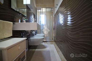La zona esterna è organizzata con grande attenzione al comfort: due eleganti gazebo accolgono rispettivamente una zona cucina e barbecue e un'area relax con doccia esterna, ideali per vivere al meglio gli spazi durante la bella stagione. Due ampie verande in muratura, riparate da tende avvolgibili microforate in PVC e un pergolato accompagnano all'interno della casa.