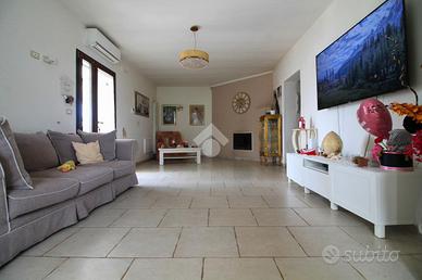 Completa la disposizione interna un pratico ripostiglio. Alle spalle della villa, con ingresso indipendente, è presente una comoda tavernetta, uno spazio versatile ideale come area hobby, zona relax o ambiente dedicato ad accogliere ospiti in totale autonomia. La villa si presenta in ottime condizioni, pronta da abitare. È dotata di riscaldamento tramite termo camino, infissi in legno con doppio vetro e persiane, porte in legno e pavimentazione in gres porcellanato effetto pietra, elementi che donano calore e carattere agli ambienti.