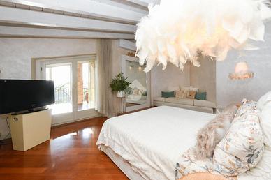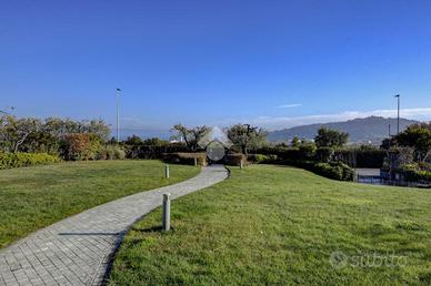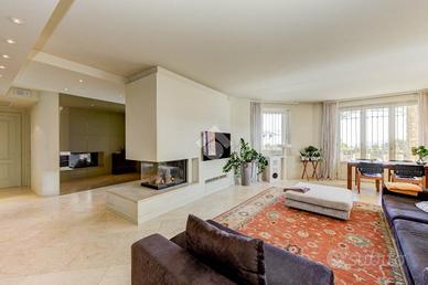 Gli spazi interni sono ampi e luminosi, caratterizzati da finiture raffinate che creano un'atmosfera calda e accogliente. Al piano terra, la zona giorno comprende un elegante soggiorno con camino, una zona pranzo e una cucina abitabile, tutte con accesso diretto al portico panoramico da cui si gode di vista lago. Le ampie vetrate permettono alla luce naturale di entrare in abbondanza, esaltando ogni ambiente. Al medesimo piano si trova un ampio bagno di servizio e si sviluppa la zona notte, che è composta da tre camere da letto spaziose, ognuna con vista sul giardino o sul lago, due delle quali con bagno privato elegante e funzionale. Tramite scala interna si accede al piano primo dove si accede alla master suite con sfogo sul terrazzo che include una grande camera da letto, una spaziosa doppia cabina armadio e un bagno privato, e altri locali adibiti a ripostiglio e sottotetto, offrendo il massimo del comfort.