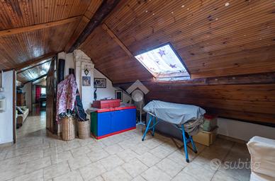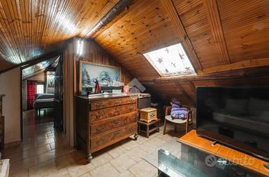 L'ingresso al piano terra abitativo, composto da un ampio bilocale su unico livello di 65 mq, avviene direttamente nel soggiorno che presenta anche una 2° porta che conduce nella parte posteriore della villa. Dal soggiorno si sfocia invece in tutti gli altri ambienti, ovvero in una spaziosa cucina abitabile, in un bagno dotato di vasca ristrutturato nel 2010 anche nelle impiantistiche e nella luminosa camera matrimoniale di dimensioni superiori alla norma, arredata con due armadi, uno a 5 ante e l'altro a 7. Una scala in legno conduce invece al piano sottotetto, di cui l'ambiente finestrato viene sfruttato dagli attuali proprietari come 2° camera, mentre gli ulteriori due ambienti, dotati di lucernari, come stanze hobby. Completa il tutto una cantina di 20 mq alla quale si ha accesso dal giardino sul retro dell'immobile. Segnaliamo inoltre che la casa presenta una doppia opzione di riscaldamento: mediante una caldaia a condensazione sostituita ad ottobre 2024 oppure tramite una stufa a pellet posizionata in soggiorno in sos.