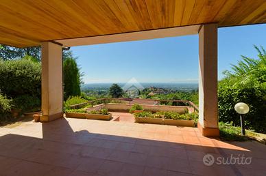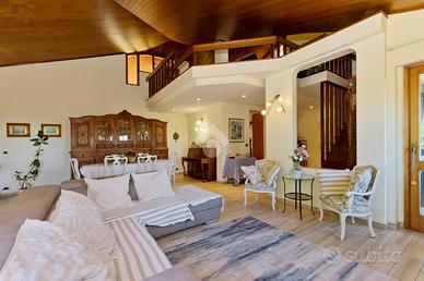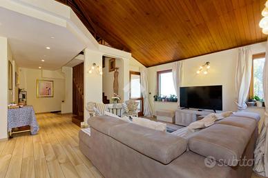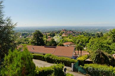 In una delle cornici residenziali più esclusive e panoramiche di Pecetto Torinese, villa indipendente libera su quattro lati, progettata per garantire comfort, privacy e un'elevata qualità abitativa. L'ingresso conduce ad un raffinato salone doppio con zona pranzo, impreziosito da un caminetto e da ampie finestre a tutta altezza che inondano gli ambienti di luce naturale e regalano scorci suggestivi sul verde circostante. La cucina abitabile, direttamente collegata all'area esterna, è ideale per pranzi all'aperto e momenti di convivialità. A completare la zona giorno un terrazzo coperto con vista panoramica, perfetto per rilassarsi o ricevere ospiti in un contesto riservato. Il disimpegno ben organizzato separa la zona giorno dalla zona notte, composta da tre camere da letto e due bagni, il tutto rifinito con materiali di pregio e attenzione al dettaglio. Una scala interna dall'architettura ricercata con dettagli in legno accompagna al piano superiore, sfruttato come locale accessorio, con affaccio scenografico sulla zona giorno sottostante. Il piano seminterrato, finestrato e luminoso, è accessibile anche dall'interno e ospita un vano aggiuntivo con bagno adibito a lavanderia Completano la proprietà un box auto di 30 mq, tre cantine e l'ampio giardino privato che circonda l'abitazione, garantendo riservatezza e uno spazio all'aperto da vivere tutto l'anno.