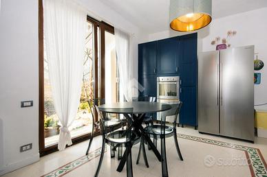 L'ingresso principale avviene attraverso un'elegante scala esterna in pietra che conduce all'ampio salone doppio, ambiente principale della zona giorno, dotato di accesso diretto sia al terrazzo frontale che al giardino privato sul retro. Sullo stesso livello si sviluppano tre camere da letto e tre bagni, distribuiti in modo funzionale e rifiniti con materiali di qualità.