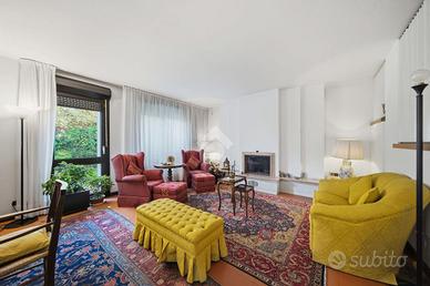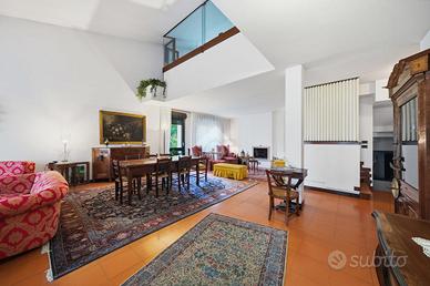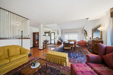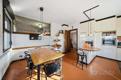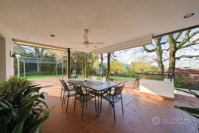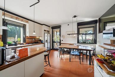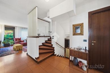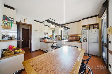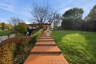 * Infine, al piano interrato si ha la taverna dotata di cucina, camino e una stanza per gli hobby, la cantina, la lavanderia/stireria, un garage doppio in larghezza e un box auto singolo molto capiente.La villa è circondata da oltre 2.000 mq di giardino piantumato, attrezzato con piscina interrata e zona barbecue.