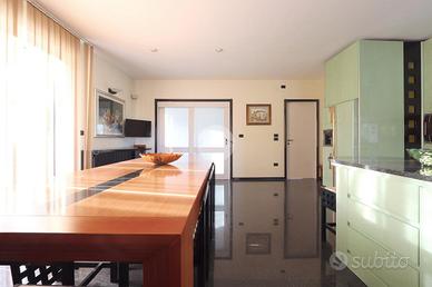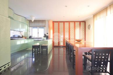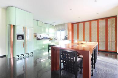 La cucina, con annesso soggiorno, affacciano su un terrazzo con vista sul giardino circostante ricco di piante ornamentali. Completa il piano terra un ampio studio e bagno con antibagno.