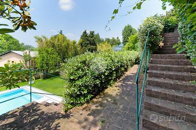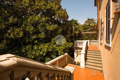 Il piano terreno accoglie gli ospiti con un ampio ingresso che conduce a un luminoso salone di rappresentanza, collegato allo studio e alla sala da pranzo formale, ideale per ricevimenti e momenti conviviali. La cucina abitabile, con zona pranzo, si affaccia sugli spazi esterni. Il livello è completato da un disimpegno, un bagno per gli ospiti e due eleganti terrazzi panoramici che si aprono sul parco, collegati da una scenografica scalinata in pietra che conduce direttamente al giardino.