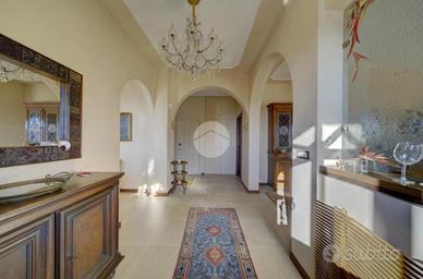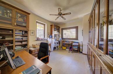 Al piano terra, l'ingresso introduce ad un ampio salone, impreziosito da grandi vetrate che garantiscono illuminazione naturale per l'intero arco della giornata. La zona giorno prosegue con la sala da pranzo e una cucina abitabile, completa di pratica dispensa. Sullo stesso livello si trovano due camere da letto, due bagni con doccia ed uno studio, facilmente trasformabile in una terza camera.