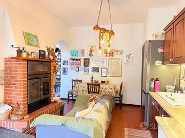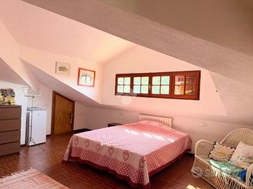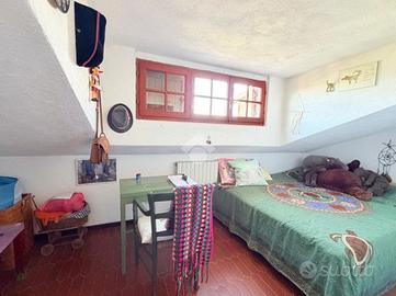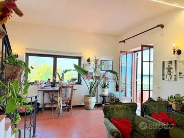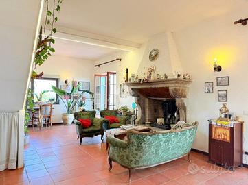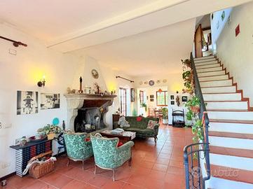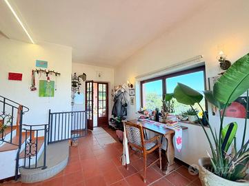 * Piano terra e primo: ampio e luminoso soggiorno con caratteristico camino del '500, proveniente da una casa colonica di Ponzano Romano, cucina con termocamino. Dal soggiorno, tramite un corridoio, si accede a uno studio molto ampio, a un'altra stanza adibita a camera da letto matrimoniale ed infine a un bagno. Dal soggiorno si accede anche a un ampio terrazzo panoramico. Proseguendo al livello superiore (sottotetto), troviamo una zona relax, tre camere da letto e un bagno.