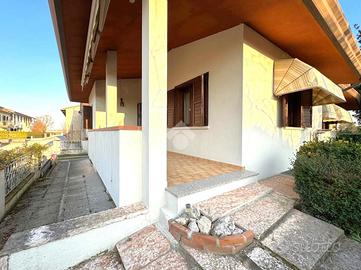 VILLA SINGOLA PONZANO VENETO (TV) L'Agenzia Mg Immobiliare affiliato Tecnocasa di Ponzano Veneto propone villa singola sita a Merlengo nel comune di Ponzano. La caratteristica principale di questo immobile è che il piano abitabile è tutto su un unico livello. All'ingresso troviamo un lungo corridoio di 10 mq che separa il soggiorno di 20,8 mq dalla cucina abitabile di 13,7 mq. Proseguendo arriviamo nella zona notte dove un pratico disimpegno dà l'accesso alla camera matrimoniale padronale di 23,7 mq, alle due camere doppie, una di 12,2 mq e una da 13,7 mq con il suo terrazzino da 4,6 mq e al bagno finestrato con vasca da 8 mq. E dalla cucina e dall'esterno si accede al vano scala che porta al piano seminterrato composto da un corridoio di 5 mq, un ripostiglio da 13,7 mq, una stanza di 23 mq adibita a taverna con caminetto, un bagno finestrato con doccia da 6 mq, uno studio da 13,7 mq, la centrale termica e lavanderia da 6,9 mq, una cantina da 17,7 mq e il garage da 40,3 mq. Concludono la proprietà due vani esterni coperti usufruibili come posti auto da 24 mq cadauno. I serramenti interni sono in legno con vetrocamera mentre gli esterni sono scuri in legno. L'immobile è contornato da verde privato di 720 mq circa su tutti i lati. La costruzione conclusa nel 1983 è stata curata e manutentata nel tempo, nello specifico tetto ed impianti periodicamente revisionati. Attualmente la caldaia è a gasolio ma c'è la possibilità di allacciamento alla rete comunale del metano sita in strada. Il tutto posto in strada secondaria esterna al traffico, allo stesso tempo vicina al centro e ai principali servizi.