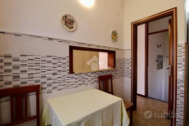 Oltrepassando il disimpegno che mette in relazione la zona pranzo/giorno al corridoio di ingresso della casa, troviamo una camera da letto matrimoniale, un bagno finestrato con box doccia e l'accesso ad un altro bagno esterno, per chi utilizza lo scoperto, ed una scala interna che porta al primo piano dell'immobile.