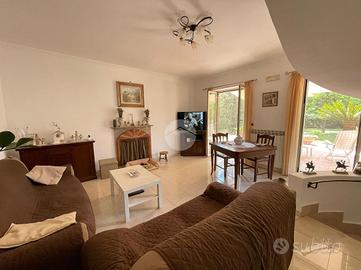 La villa, con ampi spazi da condividere con amici e parenti in occasioni speciali o nel tempo libero, è cosi distribuita: al piano terra accediamo alla zona giorno con salone, cucina, studio e bagno. Una bellissima scala con lucernaio ci fa accedere al primo piano in cui troviamo la zona notte con ben 3 camere da letto e due bagni , di cui uno in camera. La particolarità di questo livello la troviamo proprio nella camera da letto che è dotata di un terrazzino a livello.