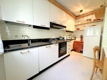 Salendo dalla scala in legno accediamo a quella che prima abbiamo chiamato zona pranzo, e dove troviamo collegata ad essa la cucina, abitabile e molto funzionale.