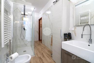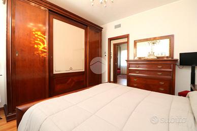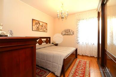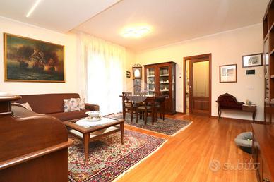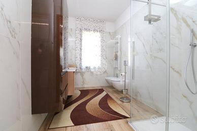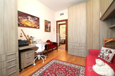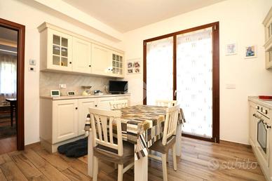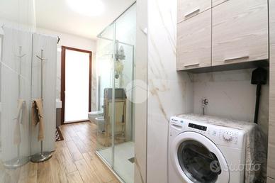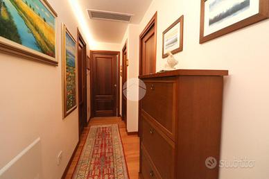 L'ingresso è accompagnato da un vialetto elegante, immerso in un giardino privato ben curato. Una volta entrati, ci accoglie un soggiorno luminoso e una cucina abitabile, arredata sui tre lati, con una porta finestra che si affaccia sul balcone. Dal disimpegno si accede alla zona notte, che comprende due camere da letto e due ampi bagni signorili, uno dei quali ha una porta finestra che conduce ad un'area cortilizia privata e al locale lavanderia.