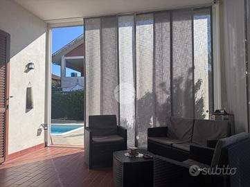 Immersa nella quiete e circondata da spazi verdi, questa villa indipendente con piscina regala fin dal primo sguardo una sensazione di accoglienza e prestigio. Ogni ambiente è stato pensato per coniugare eleganza, funzionalità e modernità, offrendo una casa ideale per chi ama vivere bene, senza rinunciare a nulla. L'accesso avviene attraverso un patio coperto e chiuso da una vetrata scorrevole, che introduce a un ingresso luminoso e curato. Superata la porta blindata, ci accoglie un ampio soggiorno con camino, cuore caldo della casa, collegato alla cucina abitabile e alla sala da pranzo. Quest'ultima gode di un doppio affaccio, da un lato sul patio, dall'altro su uno spazio esterno attrezzato per pranzi e cene all'aperto, che si apre verso il giardino con la piscina interrata di recente realizzazione, ideale per i momenti di relax e convivialità. Al piano terra si trovano inoltre un bagno con doccia e il collegamento diretto al box auto, una comodità preziosa nella vita quotidiana. La zona notte, situata al piano superiore, offre ben cinque camere da letto, un ripostiglio e una grande sala da bagno con vasca e doccia. Dal balcone una scala a chiocciola conduce alla mansarda con travi a vista, completa di bagno privato e impreziosita da una suggestiva vista sulle montagne, che regala un'atmosfera intima e rilassante. Al piano interrato, accessibile sia dall'interno che dall'esterno, trovano spazio una taverna rifinita, la cantina, la lavanderia e un ulteriore box auto doppio, rendendo questa villa perfetta anche per chi cerca ambienti versatili e funzionali. Negli anni la proprietà è stata oggetto di interventi importanti, che ne hanno migliorato efficienza e comfort dagli infissi in PVC alla nuova caldaia, dall'impianto fotovoltaico al rifacimento del tetto, fino alla piscina di ultima realizzazione. A completare il tutto, un moderno sistema di antifurto perimetrale e volumetrico con telecamere, che garantisce sicurezza e serenità in ogni momento. Questa villa ra...